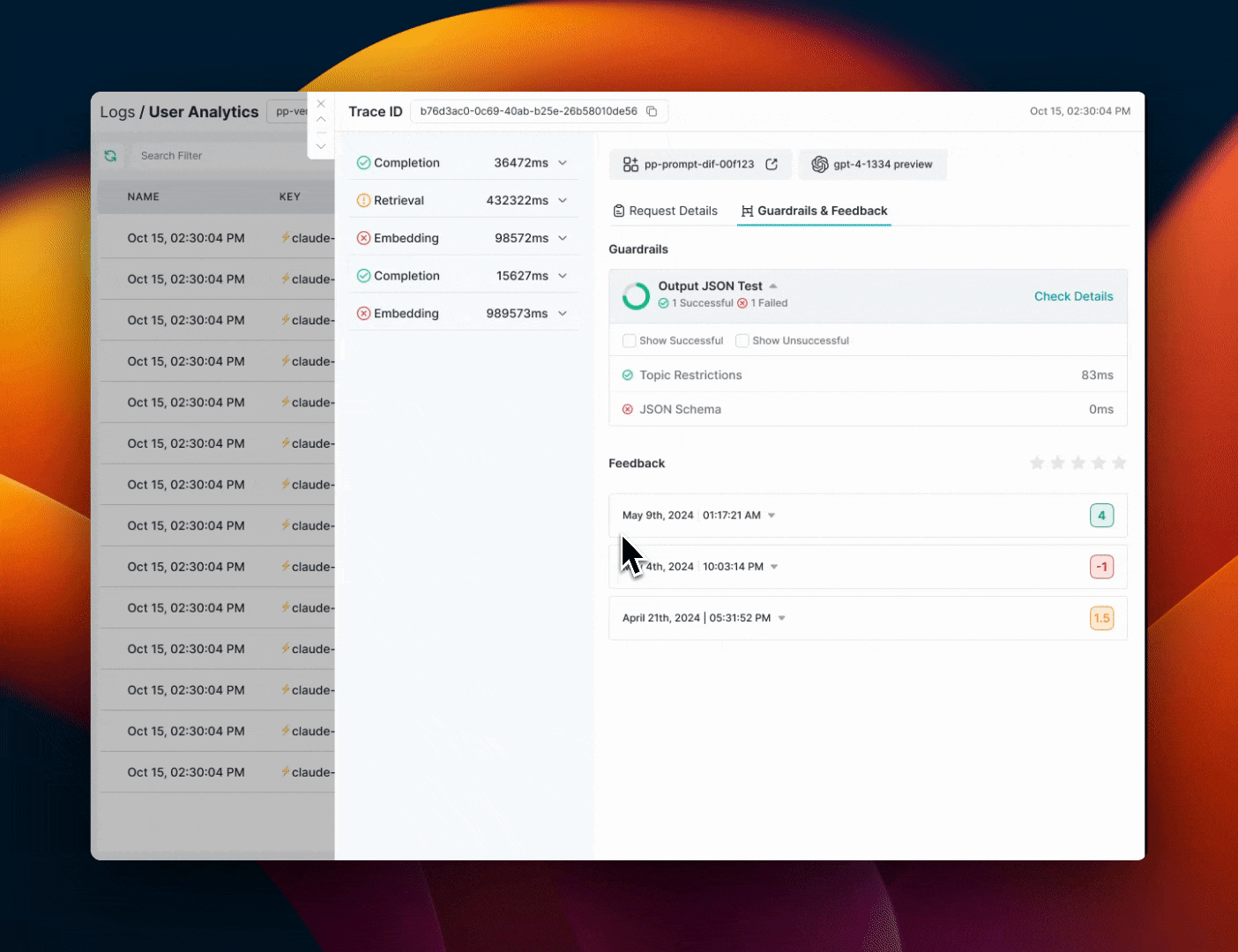 On SuccessSend FeedbackIf all of the Guardrail checks PASS, append your custom defined feedback to the requestWe recommend setting up this actionThis will help you build an β€œEvals dataset” of Guardrail results on your requests over time